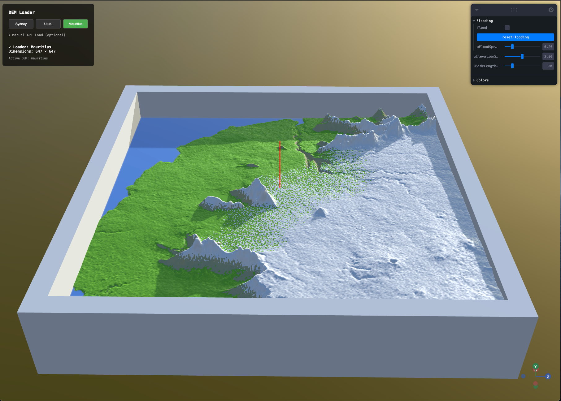 Visual representation and simulation of digital elevation model data experiencing a flood. Incudes cloud functions API to get dems on any lon/lat coordinates as well as three presets.